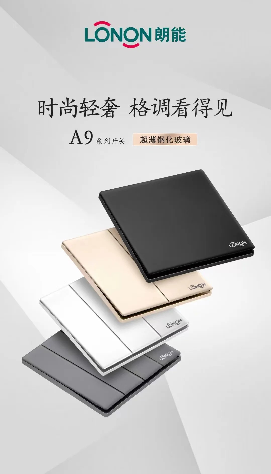 A9係列開關,采用超薄鋼化玻璃(lí)麵板(bǎn),牆壁開關藝術集(jí)大成者,擁有充滿高級感的質地,纖薄輕盈的體態,時尚輕奢的格調,瞬間升華了牆麵和(hé)空(kōng)間。